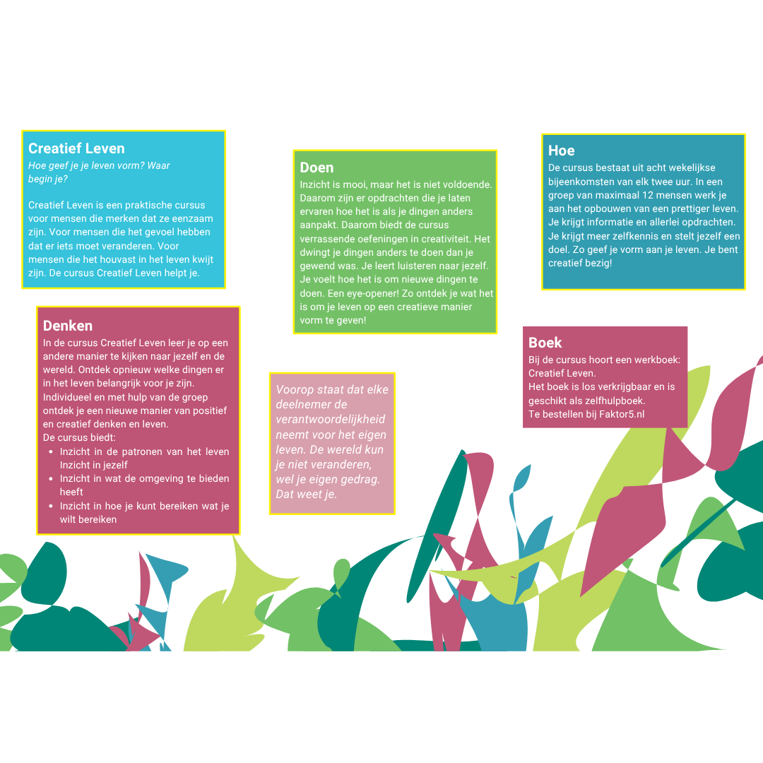 Dat begint met de folder. Er is één folder voor Creatief Leven. De bedoeling is dat je deze gebruikt. Om het je zo gemakkelijk mogelijk te maken, hieronder twee versies